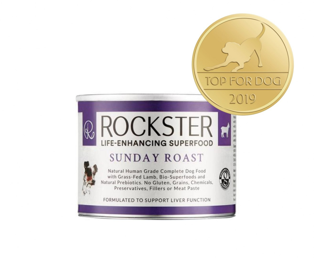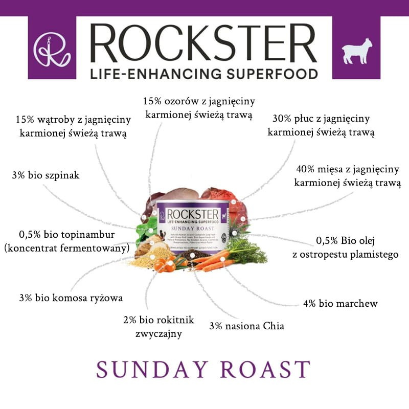 - ROCKSTER SUPERFOOD SUNDAY ROAST Jagnięcina karmiona świeżą trawą Organiczna, certyfikowana, kompletna mokra karma dla dorosłych psów. FORMUŁA NAUKOWA WSPIERAJĄCA PRACĘ WĄTROBY I SYSTEMU ODPORNOŚCIOWEGO