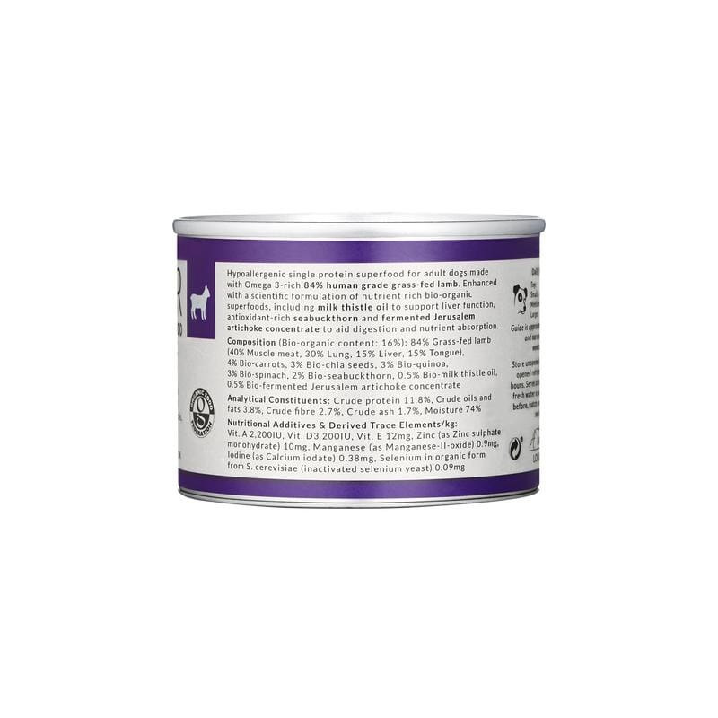 To unikalna receptura wymagająca delikatnego gotowania w celu zachowania ważnych składników odżywczych i witamin. Karma zawiera 84% jagnięciny karmionej świeżą trawą, zachowując idealną równowagę pomiędzy mięsem mięśniowym i wartościowymi organami wewnętrznymi. Niezbędne dodatkowe składniki odżywcze są dostarczane dzięki starannie opracowanej mieszance organicznych składników superfoods, w tym rokitnik, marchew, nasiona chia, komosa ryżowa, szpinak i olej z ostropestu plamistego, tworząc zrównoważone i smaczne pożywienie dające wiele korzyści zdrowotnych. Receptura została wzbogacona o koncentrat sfermentowanego topinamburu, który ma bardzo korzystne działanie prebiotyczne, wspomaga trawienie i zdolność przyswajania składników odżywczych zawartych w karmie. Połączenie nasion chia, komosy ryżowej, rokitnika i oleju z ostropestu plamistego zapewnia wiele korzyści zdrowotnych, szczególnie wspomagając pracę wątroby i układu odpornościowego.