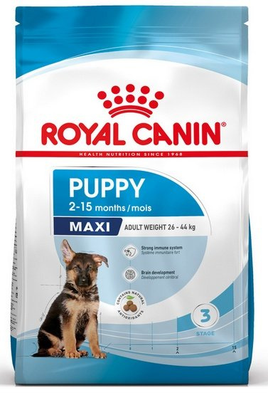 - Royal Canin Maxi Puppy karma sucha dla szczeniąt ras dużych 26kg-44kg, do 15 miesiąca Szczenięta do 15. miesiąca życia Rozwiązanie żywieniowe opracowane specjalnie dla szczeniąt psów ras dużych...