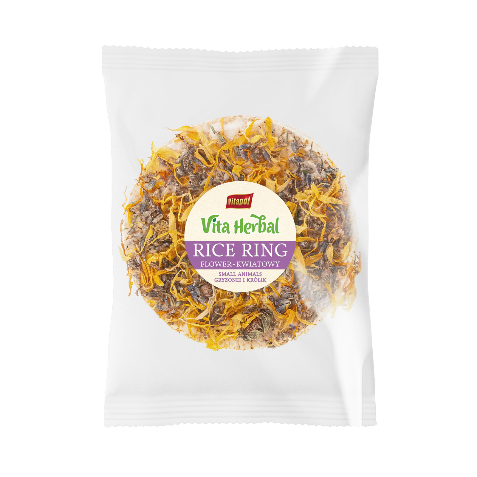 Ryżowe ringi kwiatowe to doskonała przekąska w formie chrupiącego ryżowego krążka oprószonego aromatycznymi płatkami lawendy oraz kwiatami nagietka. Stanowi zdrowe urozmaicenie codziennej diety zwierząt, dostarczając im cennych składników odżywczych.