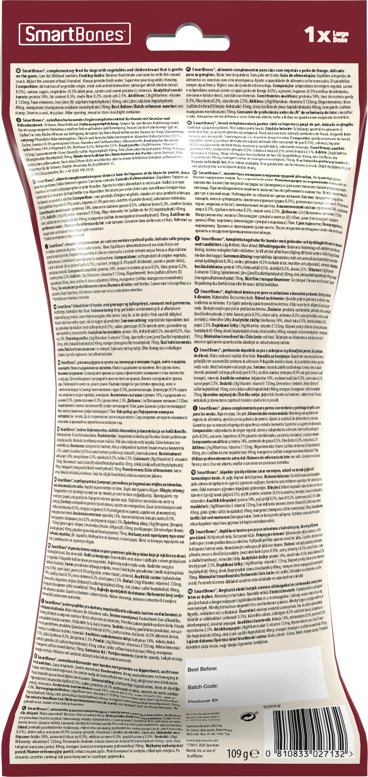 SmartBones® Chicken Bone to przepyszna kość do żucia bez skóry (no rawhide) ze smakowitym kurczakiem. Rozmiar Large jest odpowiedni dla psów dużych ras. Podwójna warstwa kości zapewnia przyjemność żucia – na początek wyborne warzywa, następnie wnętrze przysmaku wypełnione mięsem. Kość jest wzbogacona w witaminy i minerały, a jej najwiekszym benefitem jest lekkostrawność i bardzo niska zawartość tłuszczu. Podczas żucia przysmaku naturalny proces ścierania czyści zęby i zapewnia ich zdrowy stan. SmartBones® Chicken Bone - Large dla psów dużych ras to idealna przekąska między posiłkami. Psy wprost przepadają za smakowitym połączeniem mięsa z kurczaka i warzyw.