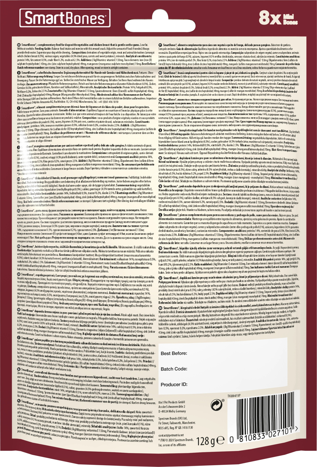 SmartBones® Chicken Bones to przepyszne kości do żucia bez skóry (no rawhide) ze smakowitym kurczakiem. Rozmiar Mini jest odpowiedni dla psów małych ras. Podwójna warstwa kości zapewnia przyjemność żucia – na początek wyborne warzywa, następnie wnętrze przysmaku wypełnione mięsem. Kości są wzbogacone w witaminy i minerały, a ich najwiekszym benefitem jest lekkostrawność i bardzo niska zawartość tłuszczu. Podczas żucia przysmaku naturalny proces ścierania czyści zęby i zapewnia ich zdrowy stan. SmartBones® Chicken Bones - Mini dla psów małych ras to idealna przekąska między posiłkami. Psy wprost przepadają za smakowitym połączeniem mięsa z kurczaka i warzyw.