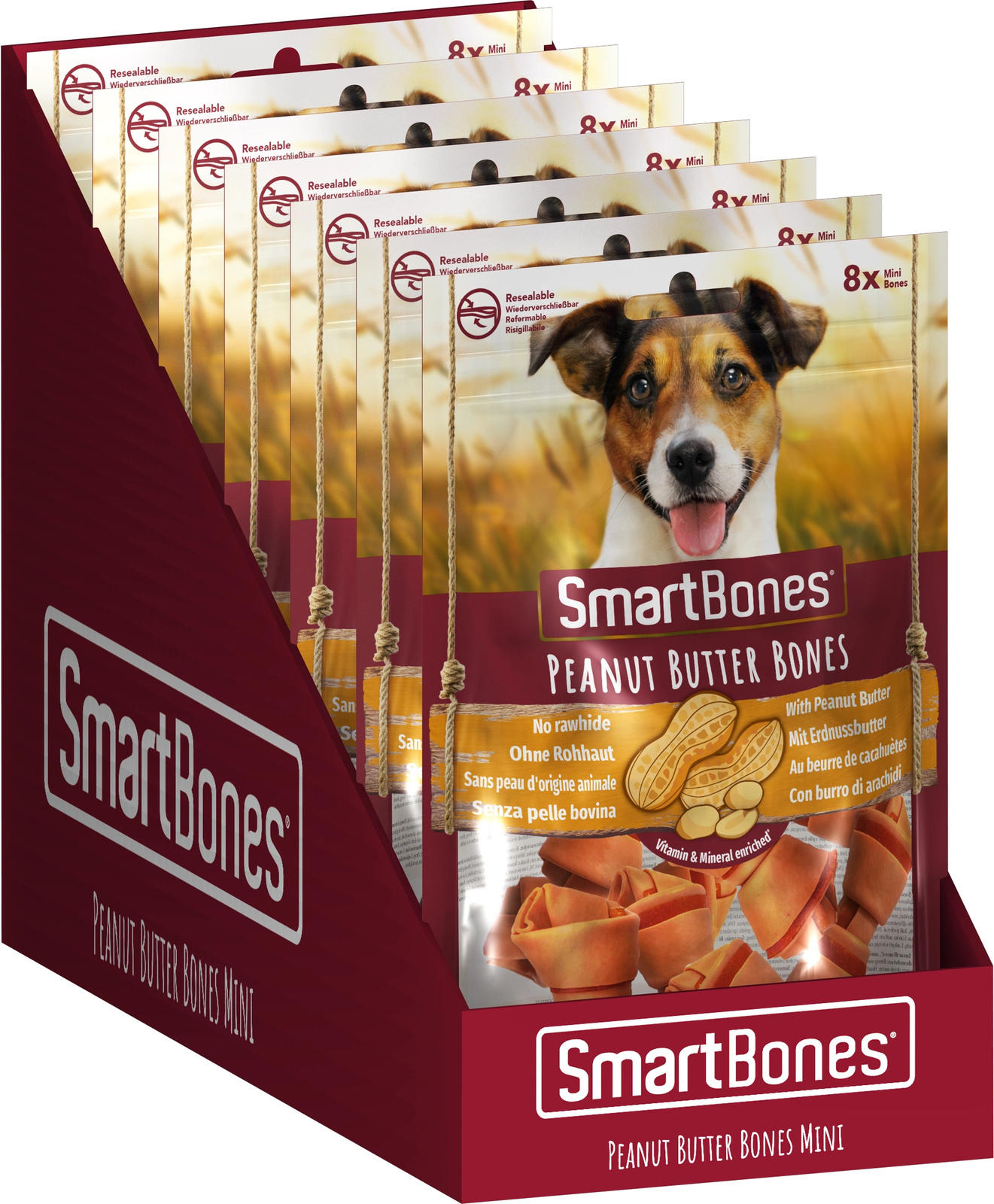 SmartBones® Peanut Butter to apetyczne kości do żucia z pysznym masłem orzechowym, bez dodatku skóry (no rawhide). Rozmiar Mini jest odpowiedni dla małych psów. Podwójna warstwa kości zapewnia przyjemność żucia – na początek wyborne masło orzechowe, następnie wnętrze przysmaku wypełnione mięsem. Kość jest wzbogacona w witaminy i minerały, a jej najwiekszym benefitem jest lekkostrawność i bardzo niska zawartość tłuszczu. Podczas żucia przysmaku naturalny proces ścierania czyści zęby i zapewnia ich zdrowy stan. Psy wprost przepadają za smakowitym połączeniem mięsa z kurczaka i masła orzechowego.