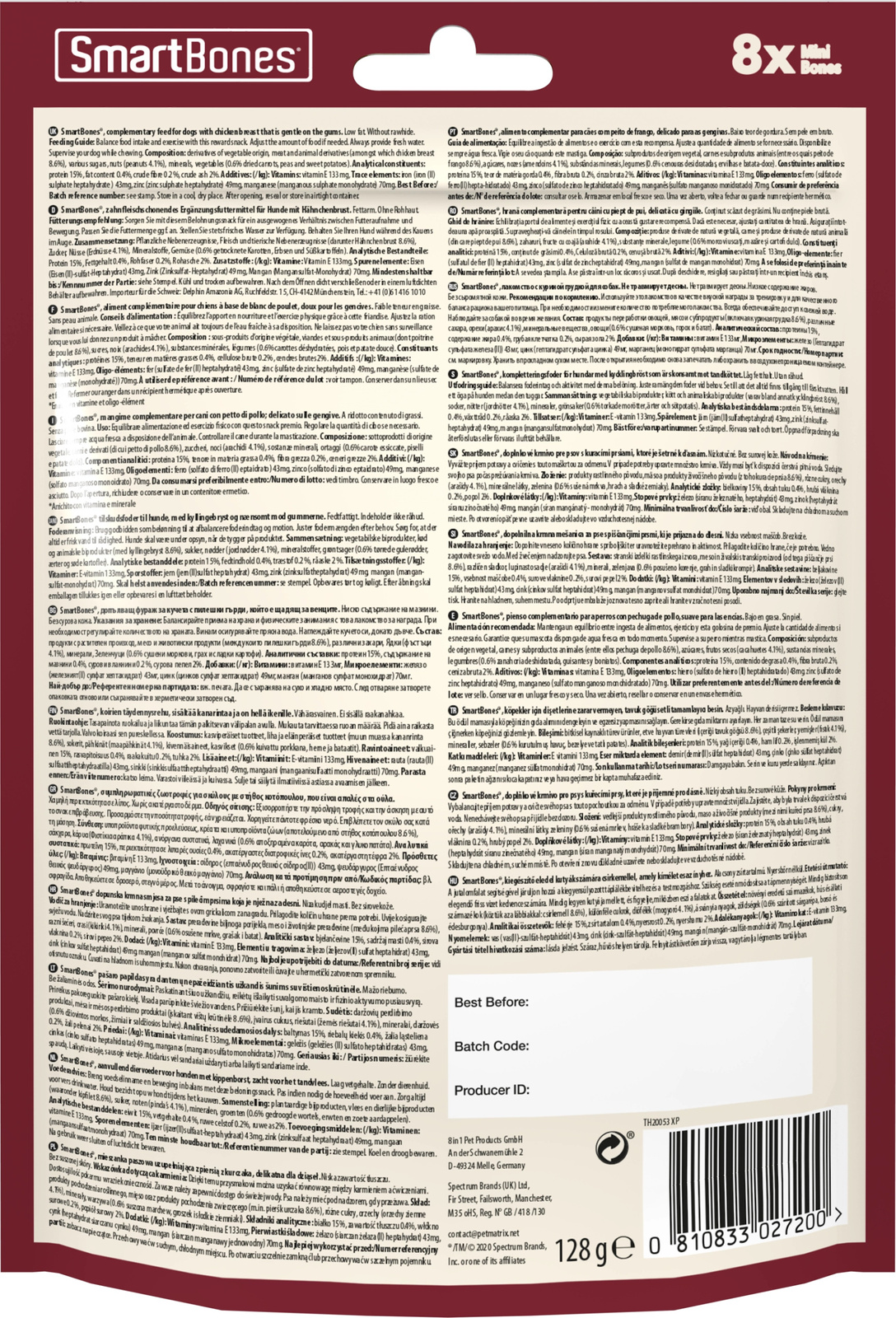 Przysmaki SmartBones® nie zawierają skóry, przez co są lekkostrawne i mają niską zawartość tłuszczu. Wzbogacone są także w witaminy i składniki mineralne. Psy wprost przepadają za tym smakołykiem.