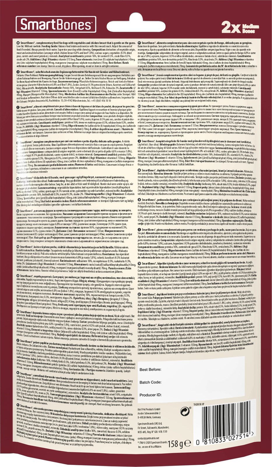 SmartBones® Beef Bones to apetyczne kości do żucia z pysznymi warzywami i aromatem wołowiny, bez dodatku skóry (no rawhide). Rozmiar Medium jest odpowiedni dla psów średniej wielkości. Podwójna warstwa kości zapewnia przyjemność żucia – na początek zewnętrzna warstwa wybornych warzyw z aromatem wołowiny, następnie wnętrze wypełnione mięsem kurczaka. Kości są wzbogacone w witaminy i minerały, a jej największym benefeitem jest lekkostrawność i bardzo niska zawartość tłuszczu (0,5%). Podczas żucia przysmaku naturalny proces ścierania czyści zęby i zapewnia ich zdrowy stan. Kości SmartBones® Beef Bones w wersji Medium są przeznaczone dla psów średniej wielkości i stanowią idealną przekąskę między posiłkami. Psy wprost przepadają za tym przysmakiem.