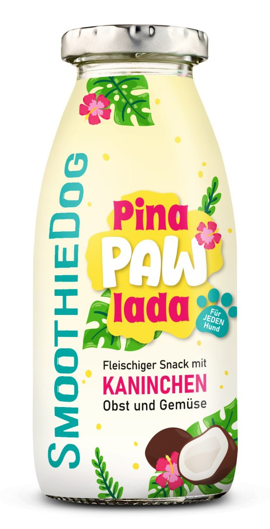 Żaden czworonożny przyjaciel nie oprze się smakowi i zapachowi mięsnego smoothie przygotowanego z mięsa królika wraz z pysznymi warzywami, owocami i superfoods. Orzeźwiający SmoothieDog PINA PAW LADA zawiera aromatyczne, delikatne i pożywne mięso z królika z jabłkami i gruszkami oraz pachnącymi latem bananami i wiórkami kokosowymi. Połączenie to sprawia, że to specjalne smoothie jest prawdziwym przysmakiem i nie powoduje uczucia ciężkości w żołądku w upalne letnie dni.