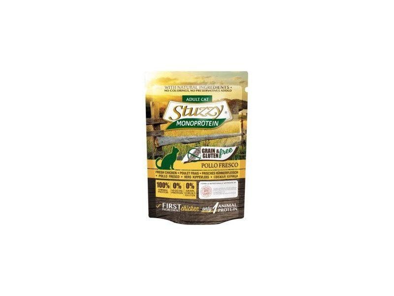 Bezglutenowa karma mokra Stuzzy Monoprotein z Kurczakiem to znakomita propozycja dla twojego wąsatego przyjaciela. Karma nie zawiera zbóż ani glutenu, jest pozbawiona konserwantów i sztucznych barwników. Mięso z kurczaka zostało natomiast wzbogacone zdrowym olejem lnianym.