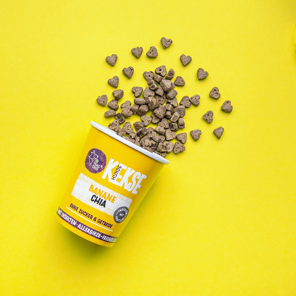 Ekologiczne CIASTECZKA DLA PSÓW z larwami chrząszczy, bananem i nasionami chia dla pobudzenia układu trawiennego i odpornościowego Twojego psa. Banan jest źródłem wielu cennych witamin i minerałów, larwy chrząszcza dostarczają dużo wartościowego białka. Nasiona chia zapewniają dobre trawienie dzięki błonnikowi i nienasyconym kwasom tłuszczowym.