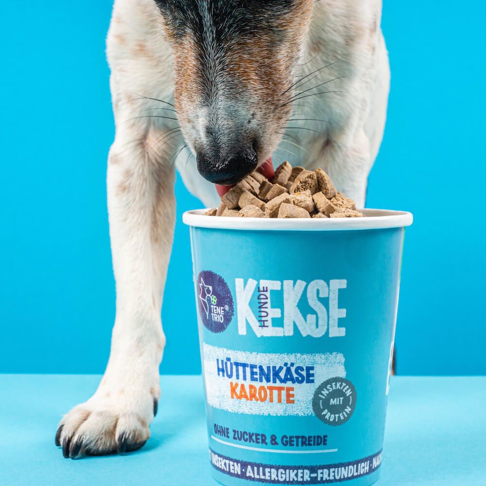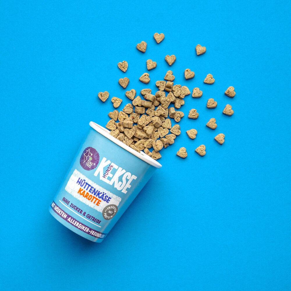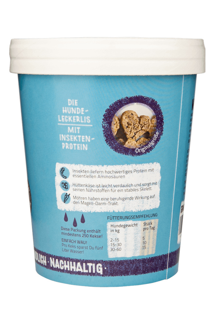 Ekologiczne CIASTECZKA DLA PSÓW z larwami chrząszczy, twarogiem i marchewką dla ochrony układu trawiennego i wrażliwego żołądka Twojego psa. Twaróg zawiera probiotyki, które działają na błony śluzowe układu pokarmowego jak łagodzący balsam. Marchewka także ceniona jest za swoje właściwości łagodzące przewód pokarmowy. Jabłka zawierają dużo błonnika i pektyn – oba te składniki chronią układ trawienny przed skutkami niestrawności. Larwy chrząszcza dostarczają dużo wartościowego białka. Nasze ciasteczka są przyjazne psom z alergiami, wrażliwym żołądkiem, nawracającymi bólami brzucha.