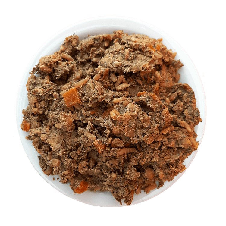 Skład:67,4% larwy Tenebrio Molitor (mus) , 10% czerwona soczewica, 10% marchew, 6% ryż, 4% mieszanka ziół, 1,4% mączka chleba świętojańskiego, 1% witaminy i minerały, 0,2% olej lniany