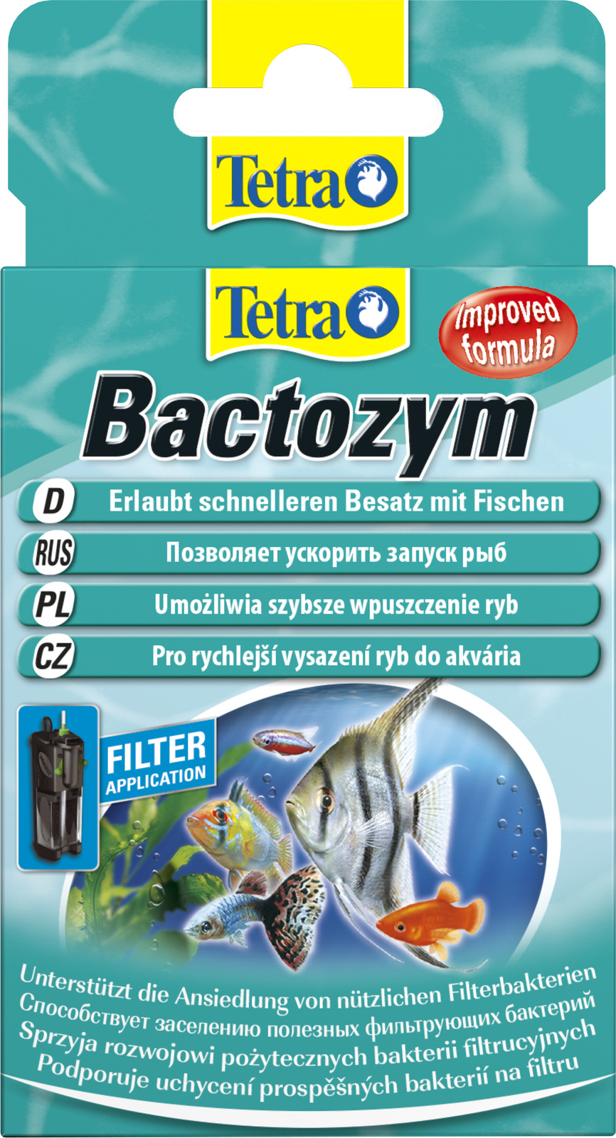 Tetra Bactozym - Tetra Bactozym przyspiesza biologiczną aktywację akwarium. Naturalne, organiczne koloidy pokrywają wkład filtra i wszystkie powierzchnie niewidoczną warstwą, wspomagającą rozwój kolonii pożytecznych bakterii filtracyjnych. Oznacza to możliwość wpuszczenia pierwszej partii ryb już po 24 godzinach od przygotowania nowego akwarium. Zarówno wodę, jak i filtr można wymieniać bez istotnej utraty aktywności biologicznej.