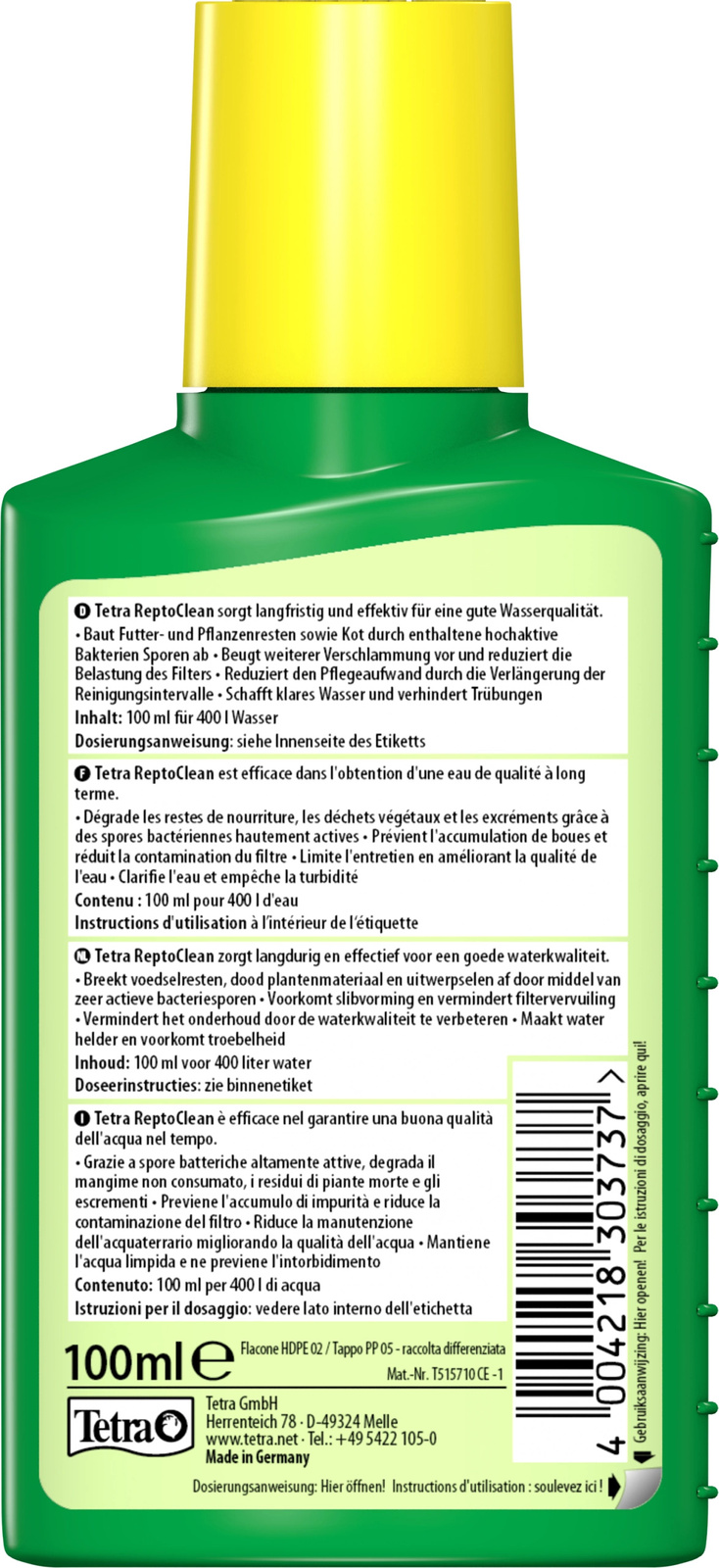 Zanieczyszczenia w terrarium wodnym, takie jak zmętnienie wody i osad na podłożu, to częste problemy opiekunów gadów wodnych. Tetra ReptoClean zawiera wysoce aktywne zarodniki bakterii, które oczyszczają wodę i skutecznie przyspieszają rozkład materiału organicznego, takiego jak niespożyty pokarm, odchody czy obumarłe rośliny. Zapewnia to dobrą jakość wody i biologicznie zrównoważone środowisko dla gadów w terrarium wodnym. Ponadto dzięki wydłużeniu okresów między kolejnymi czyszczeniami zmniejsza się nakład pracy związany z utrzymaniem czystości. Tetra ReptoClean jest łatwy i szybki w użyciu dzięki innowacyjnej formule płynu. Może być stosowany co miesiąc lub po każdej wymianie wody.