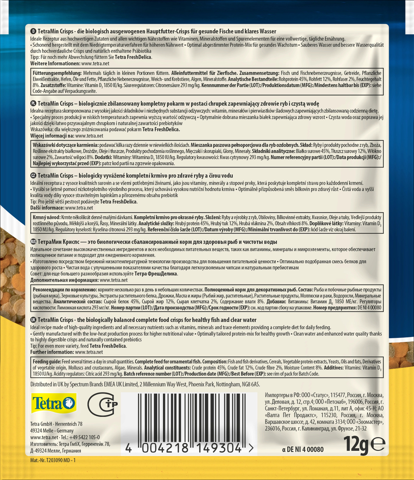 - dzięki procesowi produkcji w niskich temperaturach, pokarm TetraMin Pro Crisps ma wysoką wartość odżywczą,