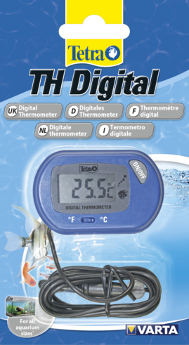 Tetra TH Digital Thermometer - Termometr został zaprojektowany do dokładnych pomiarów temperatury wody w zbiorniku. Posiada czytelny cyfrowy wyświetlacz umieszczony w niebieskiej obudowie. Termometr nadaje się do zbiorników wszystkich rozmiarów i posiada w zestawie baterię Varta.