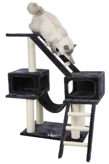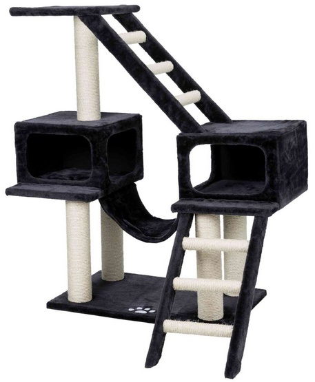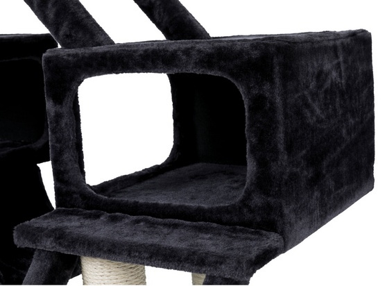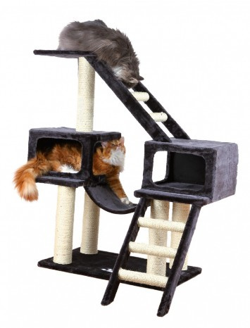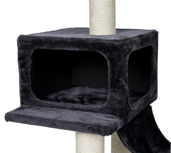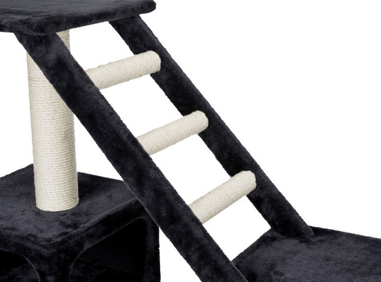 Drapak z dwoma domkami i półką, które są połączone przy pomocy drabinek i drugiej półki. Staranne wykonanie sprawia, że drapak staje się ozdobą pokoju. Słupki oraz szczebelki drabinek są pokryte sizalem, a wykończenie pozostałych elementów jest z przyjemnego pluszu, w szarym kolorze (antracyt).