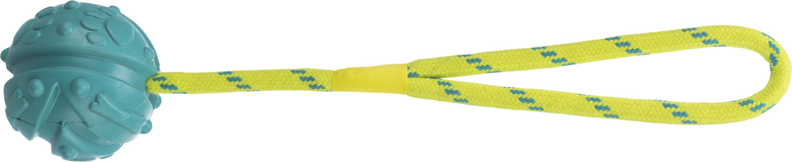 - Piłka kauczukowa z przymocowanym sznurem. Średnica piłki 7 cm, długość liny 35 cm. Zabawka nadaje się do rzucania, aportowania, przeciągania siłowego. Zabawka pływająca. Kolor losowy.