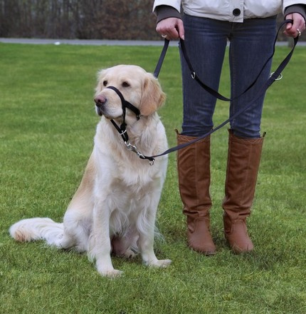 • Zabezpiecza przed pogryzieniem jeśli jest ciasno zapięta. Można ją poluzować i wtedy pies swobodnie otwiera pysk. Pod pyskiem znajduje się metalowe kółeczko do którego można przypiąć smycz gdy pies mocno ciągnie właściciela, wtedy działa jak typowy kantar.