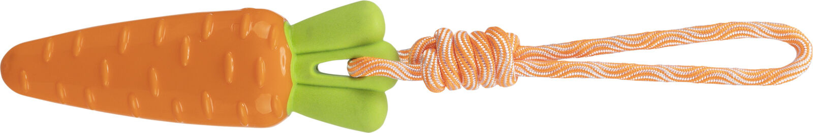 Marchewka na sznurku przeznaczona jest dla psów i wykonana jest z gumy termoplastycznej (TPR) lub poliestru. Dodatkowo wydaje dźwięki, co sprawia, że jest jeszcze bardziej atrakcyjna dla czworonoga podczas zabawy.