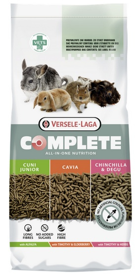 Versele-Laga Complete Chinchilla & Degu to żywienie bez zmartwień. Niezwykle smaczne ekstrudaty przygotowane wg koncepcji "wszystko w jednym" zapobiegają selektywnemu pobieraniu pokarmu. Dzięki temu Twoja szynszyla albo koszatniczka otrzymuje wszystkie niezbędne substancje odżywcze pozwalające jej cieszyć się pełnią zdrowia. Pokarm bez dodatku cukru, zapewnia witalność i optymalną kondycję. Siemię lniane, jako źródło kwasów omega-3, dobrze wpływające na sierść oraz długie włókna, zapewniają optymalne trawienie, są specjalnie dostosowane do potrzeb żywieniowych szynszyli i koszatniczek. Versele-Laga Complete Chinchilla & Degu został przygotowany przez lekarzy weterynarii w oparciu o zaawansowane badania.