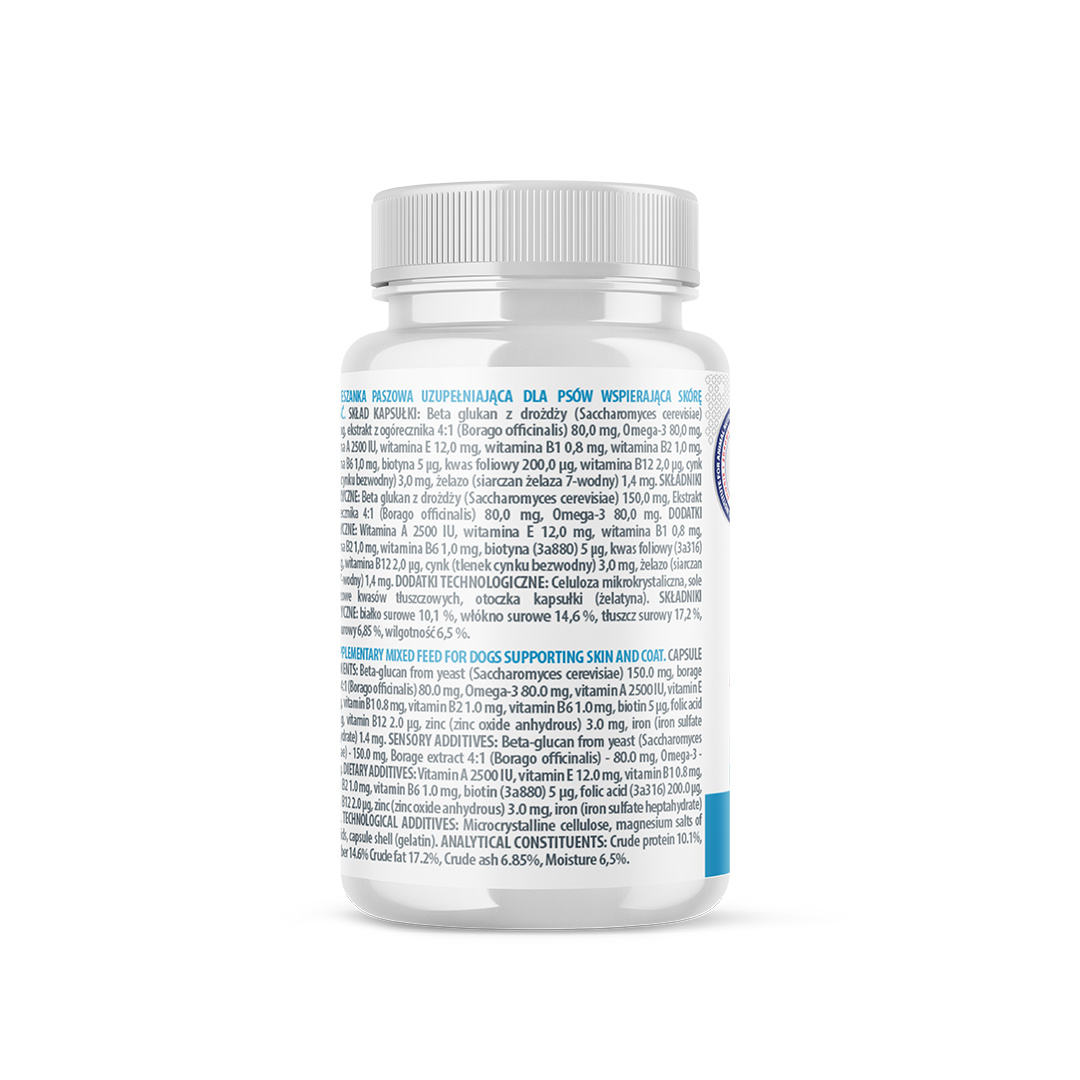 Preparat w formie proszku zamkniętego w kapsułkach dla psów po 6 miesiącu życia. Szczególnie polecany psom borykającym się z różnorodnymi problemami dermatologicznymi będącymi wynikiem alergii pokarmowych, atopowym lub pchlim zapaleniem skóry. Można podawać go psom z przesuszoną skórą, świądem, a także w przypadku matowej sierści lub nadmiernego linienia. Preparat pomaga w utrzymaniu zdrowej skóry i sierści, więc można go podawać w celach prewencyjnych.