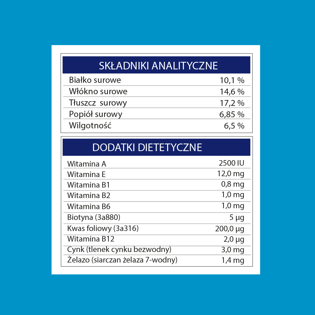 SKŁADNIKI ANALITYCZNE: białko surowe: 10,1%włókno surowe: 14,6%tłuszcz surowy: 17,2%popiół surowy: 6,85%wilgotność: 6,5%