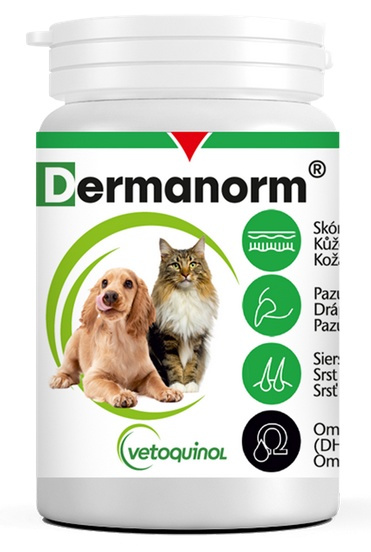Dermanorm - dietetyczna karma uzupełniająca w postaci kapsułek, z których każda zawiera kwasy tłuszczowe omega 3 i omega 6. Źródłem tych nienasyconych kwasów tłuszczowych są olej rybny i olej z ogórecznika, konieczne dla prawidłowego funkcjonowania skóry i jej wytworów (sierść, pazury itp.).