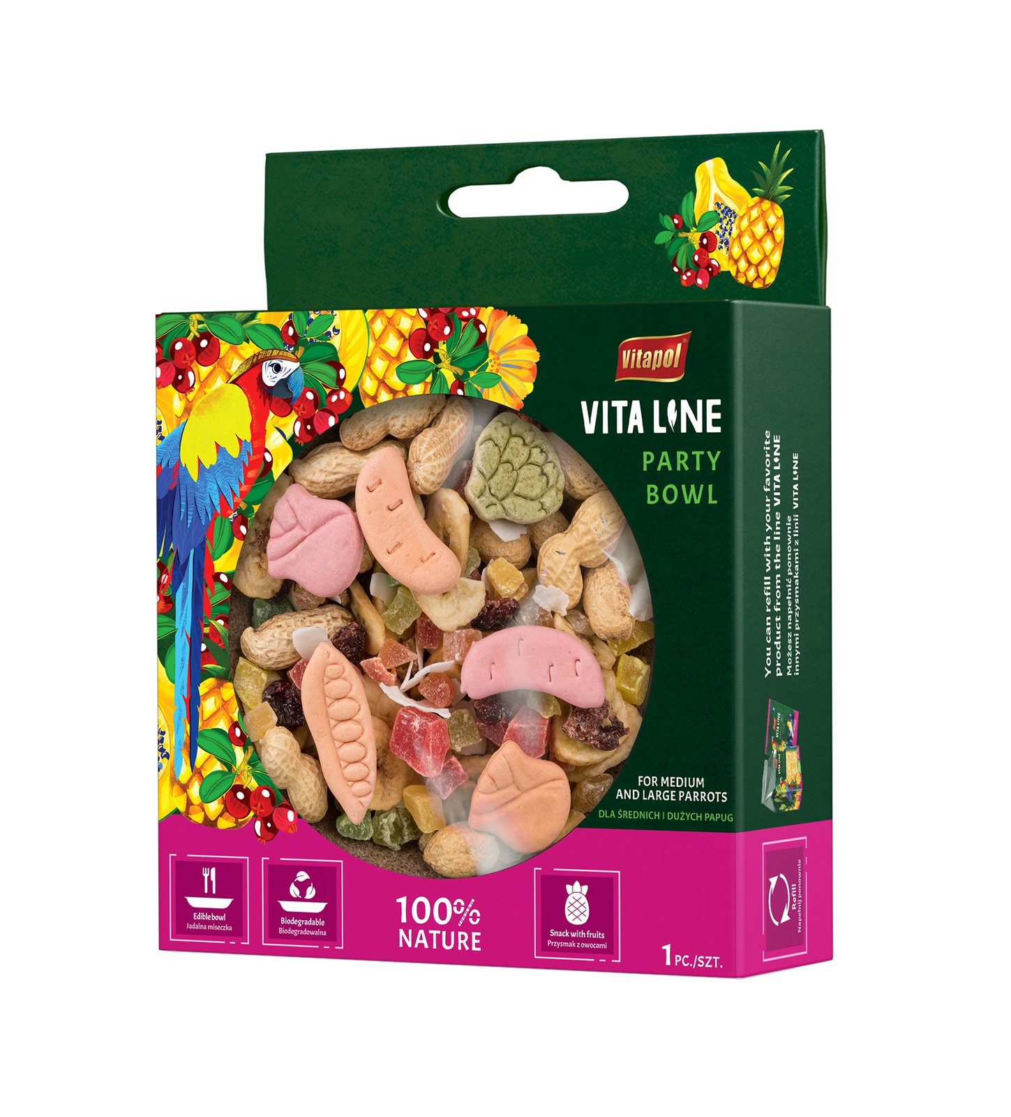 Party Bowl to miseczka z otrąb nadająca się do spożycia przez ptaki, wypełniona przysmakami uzupełniającymi codzienną dietę. Mix owoców tropikalnych, takich jak ananas, papaja, banan i kokos, zachęca większe papugi do spożycia. W miseczce znajdują się rów