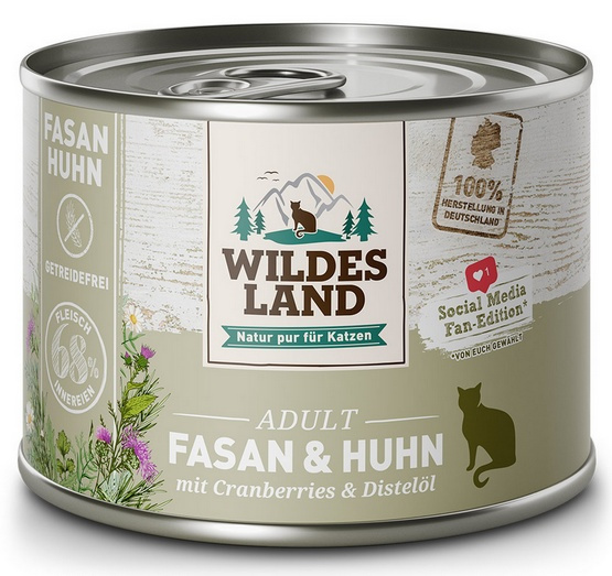 Poznaj niezwykłą karmę: Social Media Fan Edition! Tak, dokładnie tak! Fani marki Wildes Land Cat w głosowaniu na mediach społecznościowych wybrali wersję z bażanta i kurczaka, a tyle kotów nie może się mylić. Bo to nie przypadek, że karma Wildes Land Cat jest tak dobrze akceptowana przez koty. Jest niezwykle smakowita, zawiera dużą ilość mięsa mięśniowego i podrobów, uzupełniona olejem krokoszowym i żurawiną. Zapewnia wszystkie składniki odżywcze i witaminy, których Twój futrzany przyjaciel potrzebuje do długiego, aktywnego i zdrowego życia.