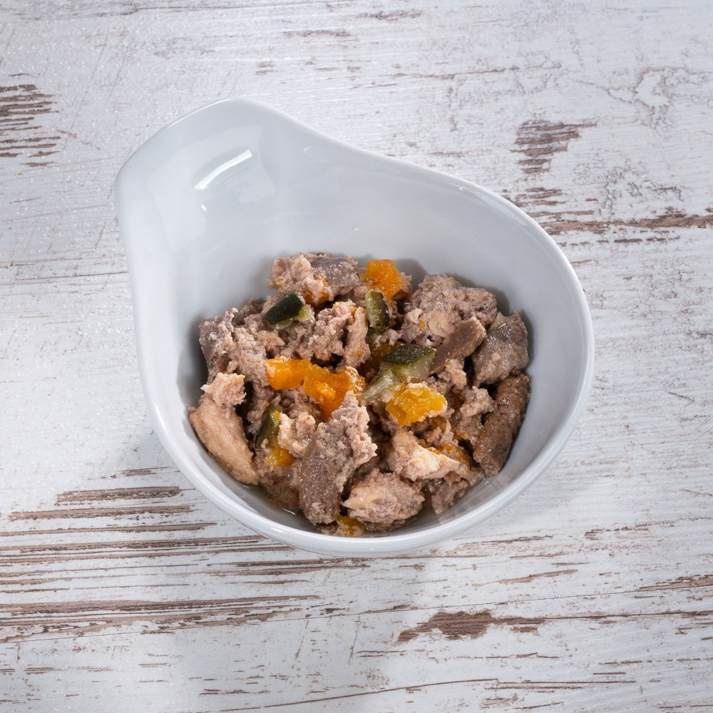 SKŁAD: Kurczak (mięso, serca, szyjki, wątróbka) 51%, bulion z kurczaka 30%, łosoś 14,2%, dynia 2%, cukinia 2%, minerały 0,5%, olej z łososia 0,2%, nagietek 0,1%.