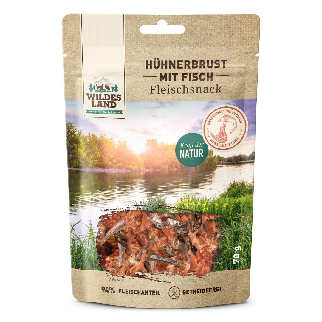 WILDES LAND Hühnerbrust mit Fisch - filet piersi kurczaka z rybkami - przysmaki mięsne dla psa i kota (70g)