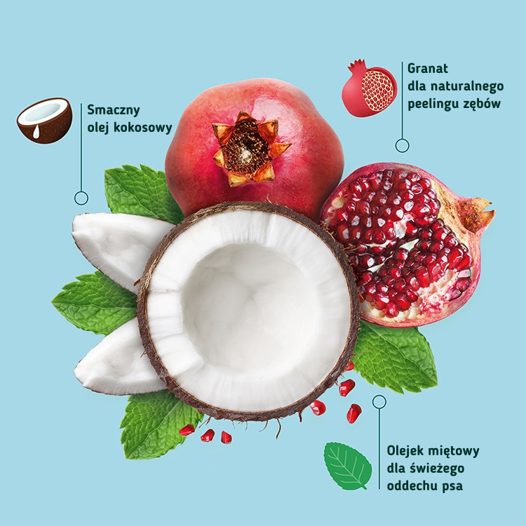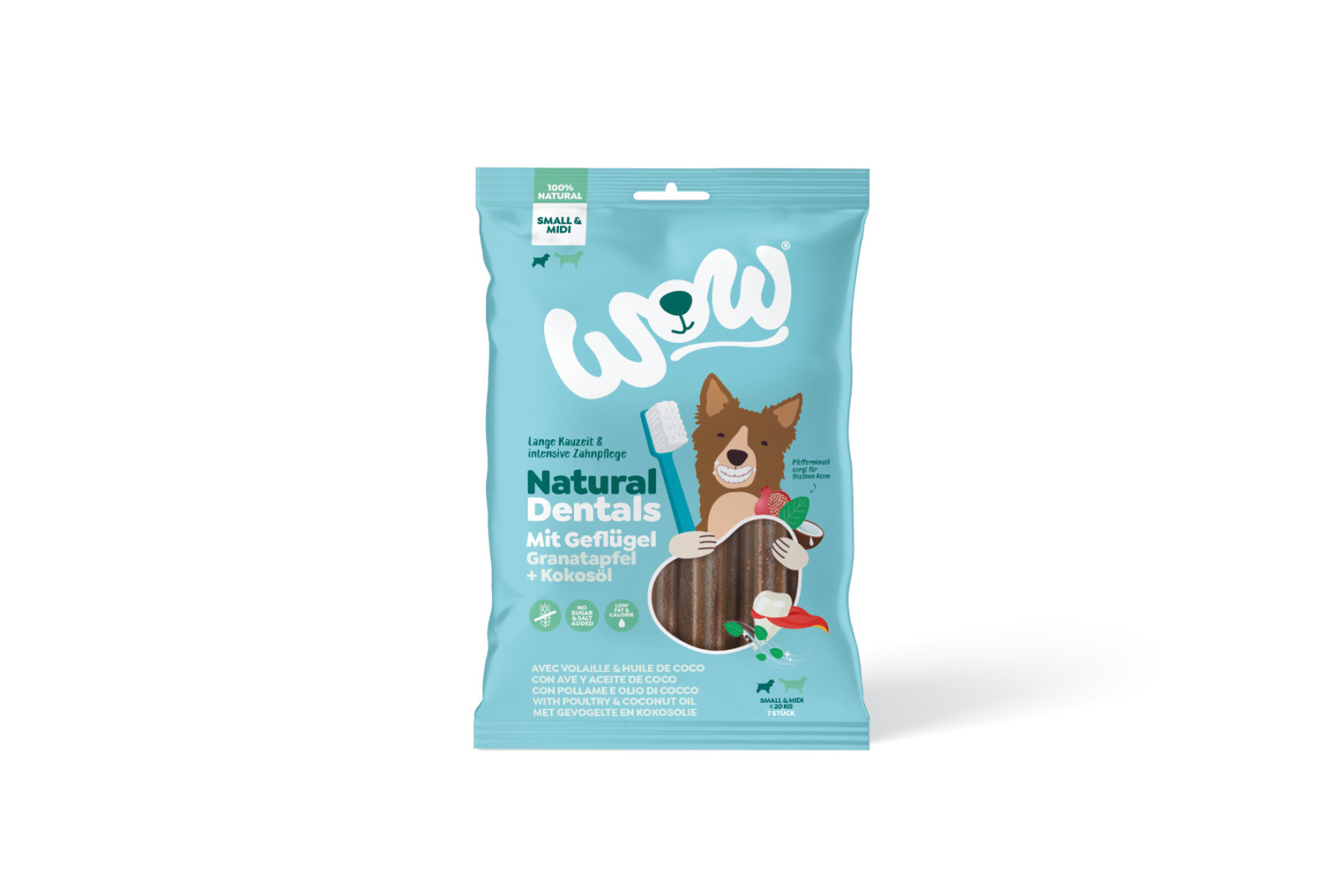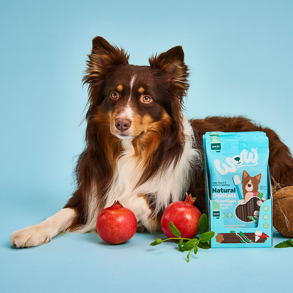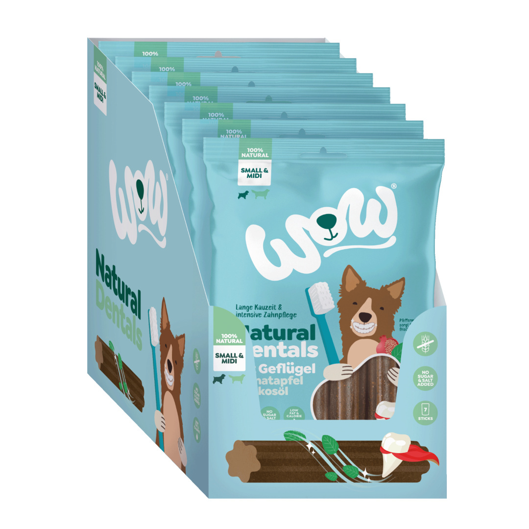 - WOW Natural Dentals z owocem granatu i olejem kokosowym - czyszczą i wzmacniają zęby, usuwają płytkę nazębną, odświeżają oddech. Dla szczeniąt od 4 miesiąca życia oraz małych i średnich psów o wadze do 20 kg.