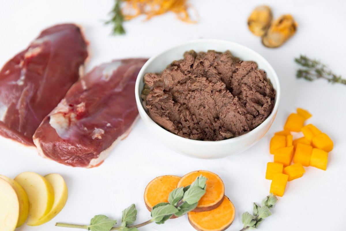 Skład: 90% świeża kaczka (70% mięso mięśniowe, 20% organy wewnętrzne), 5% bataty, 3% mieszanka prozdrowotna: (banan (5982 mg/kg), karczoch (4486 mg/kg), cykoria (4813 mg/kg), lucerna (2393 mg/kg), jabłka (2094 mg/kg), dynia (1794 mg/kg), żurawina (1495 mg/kg), małża zielonowargowa 1346 mg/kg), zielona herbata (1196 mg/kg), rozmaryn (1047 mg/kg), tymianek (897 mg/kg), oregano (748 mg/kg), ostropest plamisty (269 mg/kg), spirulina (239 mg/kg), oliwa z oliwek (209 mg/kg), jukka, cordyceps (179 mg/kg), shiitake, mniszek lekarski, imbir, kurkuma), 1% olej z pstrąga, glukozamina (1000 mg/kg), chondroityna (850 mg/kg), MSM (650 mg/kg).