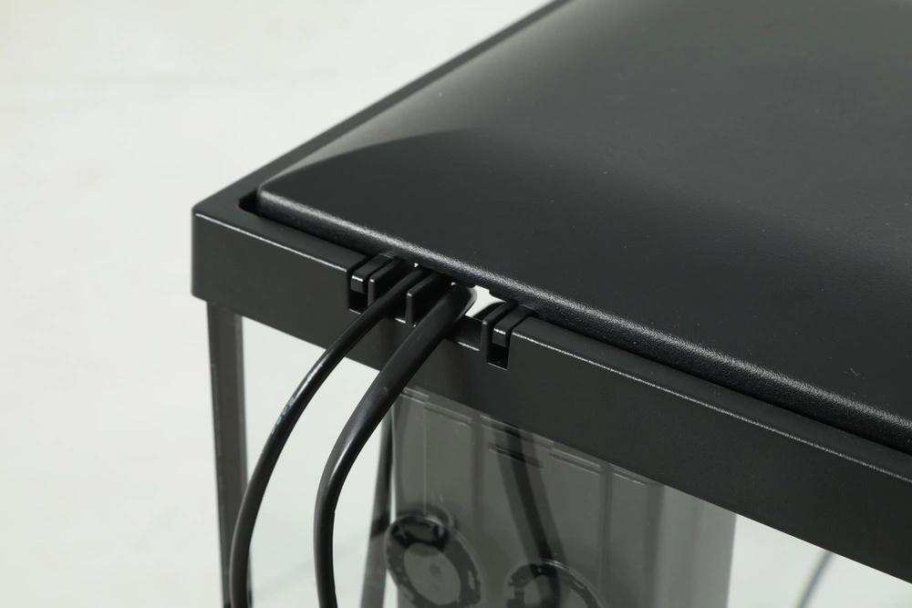 Akwarium wykonano z solidnego szkła o grubości 3 mm, które gwarantuje trwałość i bezpieczeństwo. Pokrywa z wytrzymałego tworzywa sztucznego chroni wnętrze zbiornika, a praktyczny otwór umożliwia szybkie i łatwe karmienie ryb. Dołączony filtr kaskadowy zapewnia skuteczną filtrację mechaniczną i chemiczną, a nowoczesne oświetlenie LED odwzorowuje naturalne światło dzienne, wspierając rozwój roślin i zdrowie ryb.