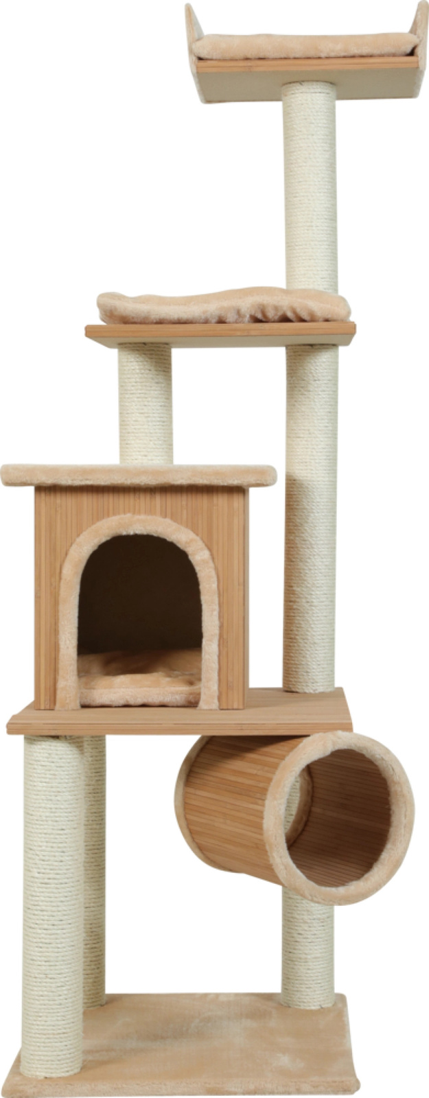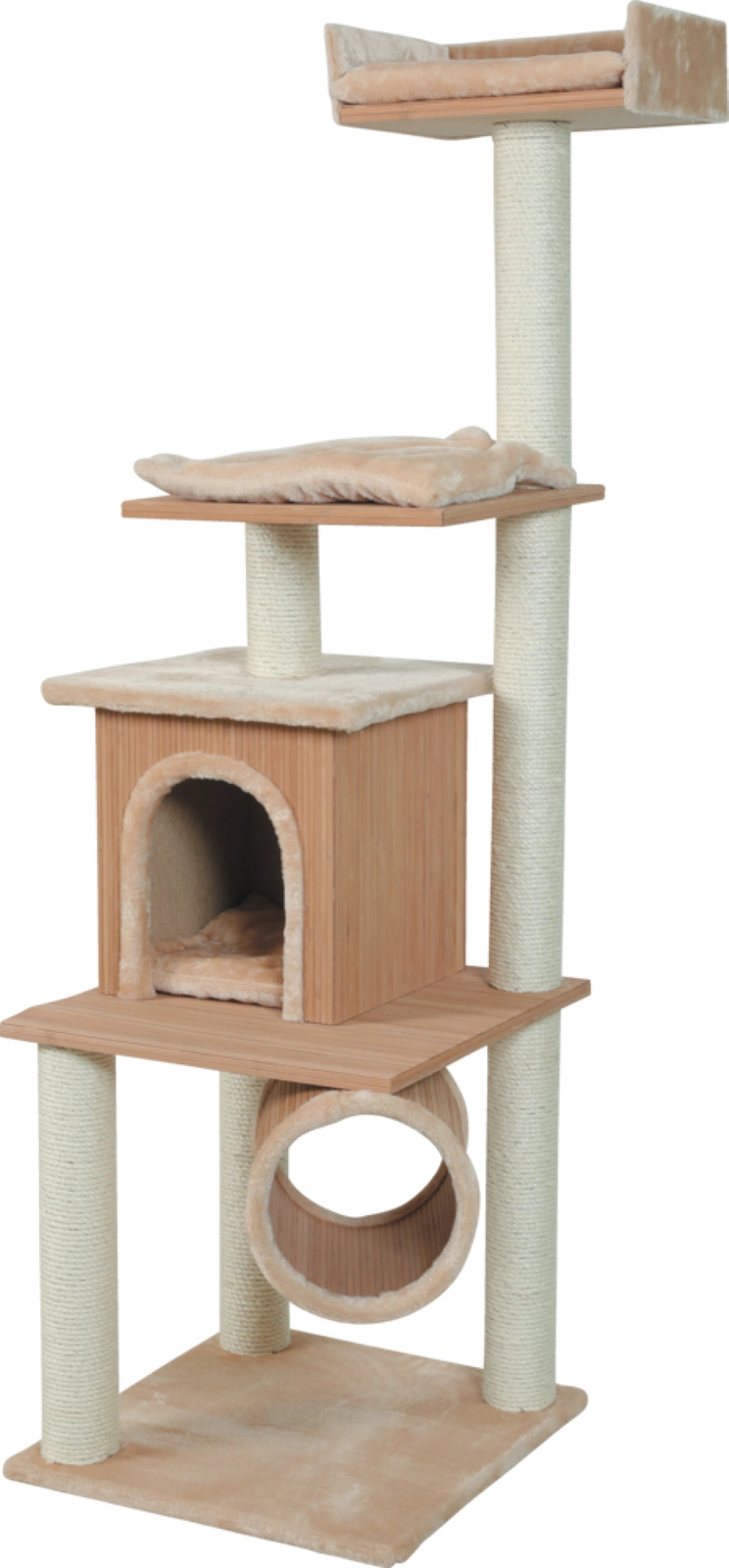 Drapak BAMBOO 5 to bambusowa budka wyścielona miękkim futrem syntetycznym, bambusowy tunel, platforma z wygodną poduszką oraz komfortowe legowisko usytuowane na szczycie drapaka. Produkt posiada liczne słupki pokryte plecionym sizalem, które umożliwiają kotu zaspokojenie naturalnej potrzeby ścierania pazurów, a także wyposażono go w wiszącą zabawkę, która obudzi w zwierzęciu instynkt łowiecki. Wysokość: 164 cm. Wyprodukowano w Europie.