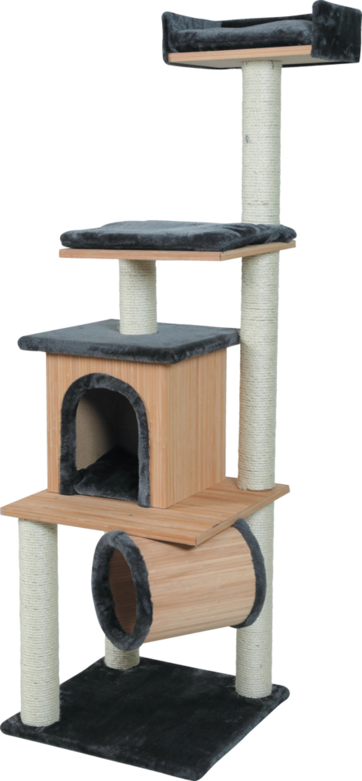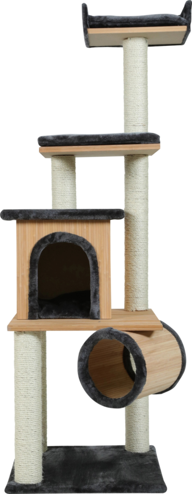 Drapak BAMBOO 5 to bambusowa budka wyścielona miękkim futrem syntetycznym, bambusowy tunel, platforma z wygodną poduszką oraz komfortowe legowisko usytuowane na szczycie drapaka. Produkt posiada liczne słupki pokryte plecionym sizalem, które umożliwiają kotu zaspokojenie naturalnej potrzeby ścierania pazurów, a także wyposażono go w wiszącą zabawkę, która obudzi w zwierzęciu instynkt łowiecki. Wysokość: 164 cm. Wyprodukowano w Europie.