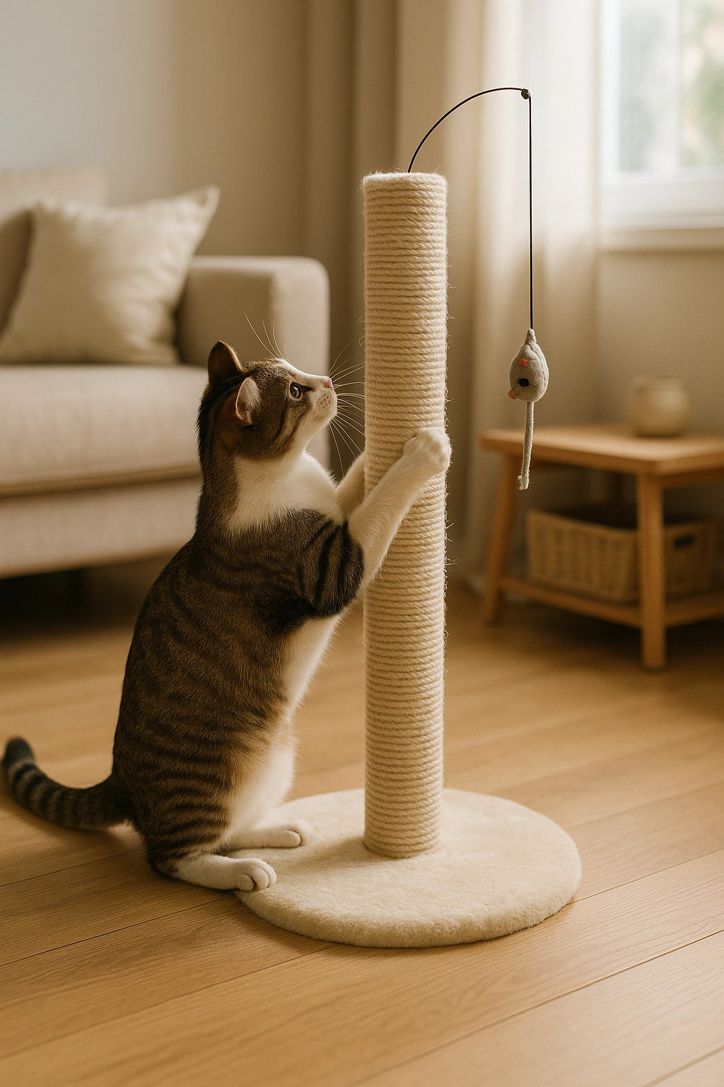 - Słupek pokryty włóknami konopnymi: Wytrzymałe i szorstkie sizalowe włókna perfekcyjnie nadają się do ścierania i ostrzenia pazurów, co wspiera zdrowie i higienę kota.