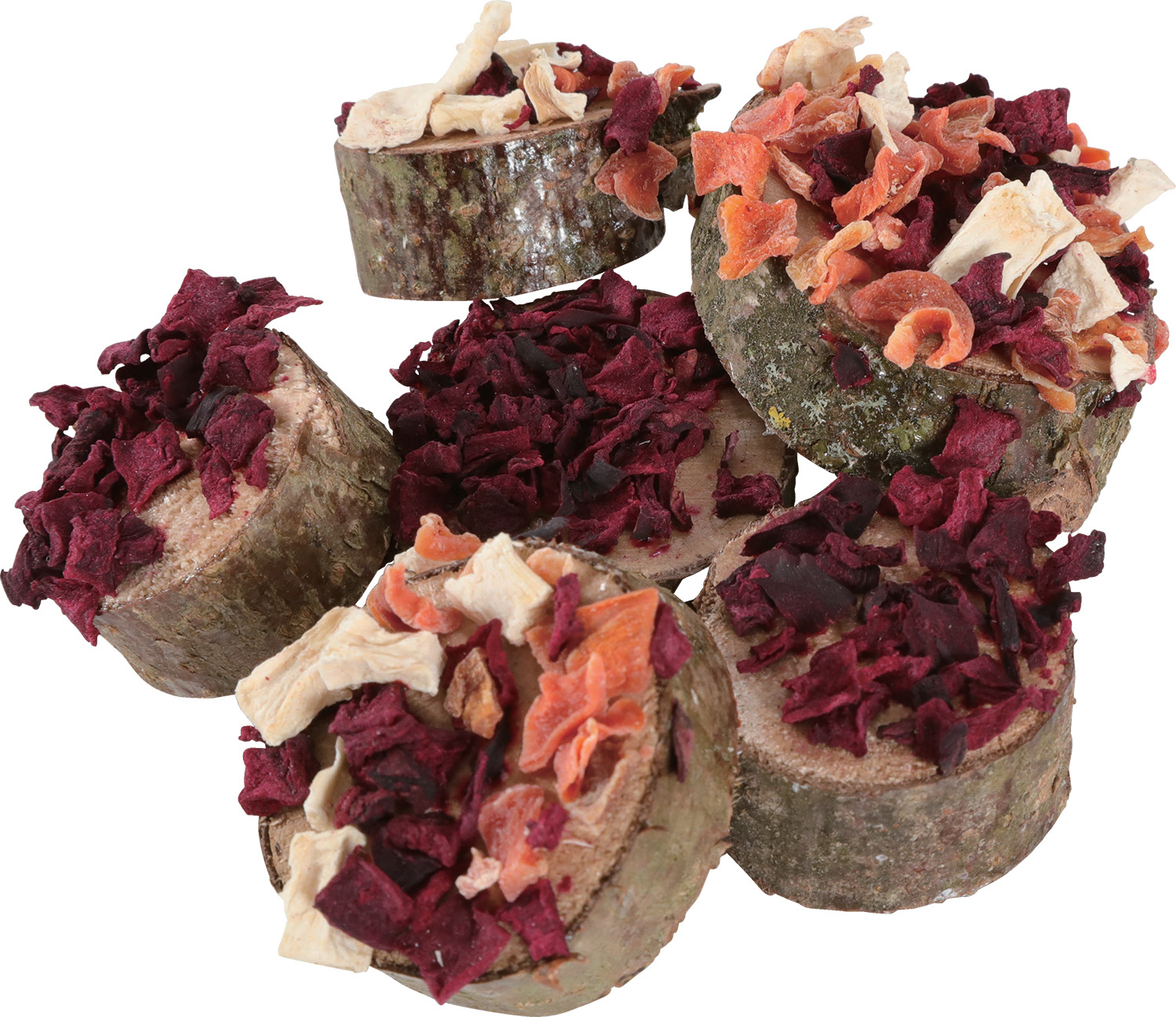 Drewniane polanka z warzywami to przekąska składająca się wyłącznie z naturalnych składników. Reguluje wzrost zębów u małych zwierząt, a zarazem jest wybornym smakołykiem. Drobne kawałki warzyw łączy z drewnianymi polankami naturalne spoiwo: skrobia ziemniaczana