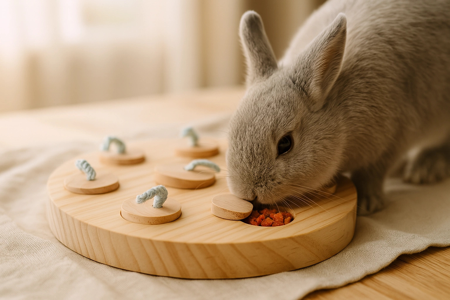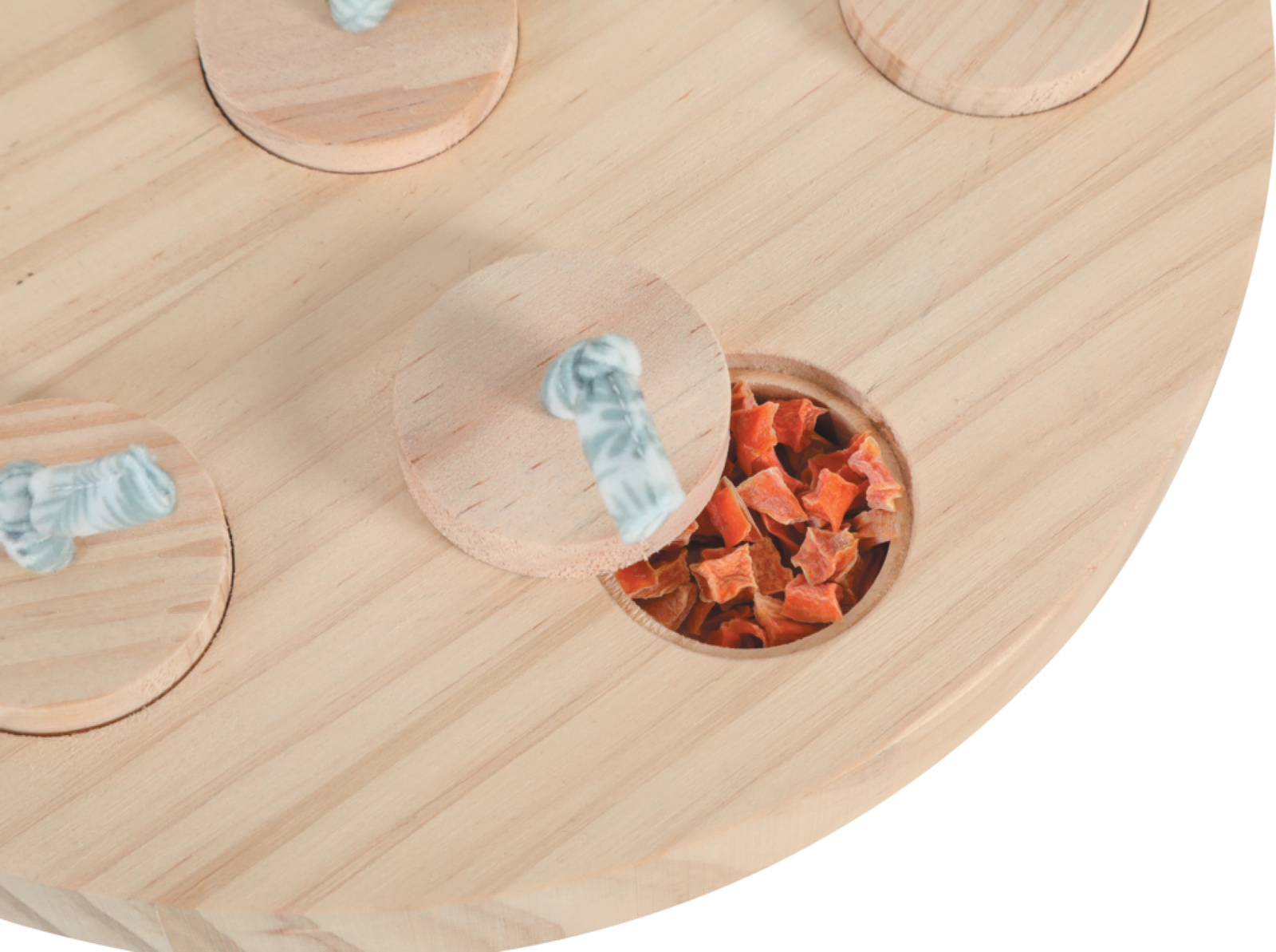 - **Interaktywna zabawa:** Talerz posiada 6 skrytek na przysmaki, które królik musi samodzielnie odkryć. Wstążeczki przymocowane do przykrywek ułatwiają zwierzęciu dostęp do ukrytych smakołyków. - **Stymulacja intelektualna:** Zabawa w odkrywanie przysmaków rozwija zdolności poznawcze królika i wzmacnia jego więź z opiekunem. - **Bezpieczeństwo i jakość:** Produkt wykonany z litego drewna posiada certyfikat FSC, co gwarantuje jego ekologiczne pochodzenie. Jest również zatwierdzony przez lekarza weterynarii, co potwierdza jego bezpieczeństwo dla zwierząt. - **Rozmiar i wymiary:** Średnica talerza to 23 cm, co sprawia, że jest idealny dla królików różnej wielkości. Wymiary produktu to 23 cm x 23 cm x 3 cm.Realne zastosowanie