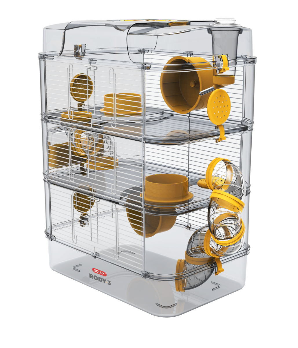 Kolekcja modułowych klatek RODY3 stworzona została z myślą o małych gryzoniach, takich jak chomiki i myszy. Klatki wchodzące w jej skład urzekają prostotą, funkcjonalnością i nowoczesnym wzornictwem. Wykonano je z wysokiej jakości plastiku, a ich estetyka sprawia, że wkomponują się w każde wnętrze. RODY3 to 4 modele klatek (mini, solo, duo i trio) w czterech wersjach kolorystycznych: białej, niebieskiej, żółtej i czerwonej. Wyjątkowym aspektem klatek z kolekcji RODY3 jest możliwość łączenia ich ze sobą dzięki systemowi tuneli. Każda klatka wyposażona jest w specjalne otwory, do których przymocować można tunele łączące. Możemy połączyć ze sobą dowolną liczbę klatek, budując w ten sposób niepowtarzalne, atrakcyjne otoczenie dla zwierzęcia. Klatki zajmują niewiele miejsca, a poręczny uchwyt ułatwia ich przenoszenie. Metalowe drzwiczki oraz otwieranie od góry ułatwiają dostęp do zwierzęcia. Prosty system bocznych zaczepów pozwala szybko rozłożyć klatkę do czyszczenia. Istnieje możliwość dokupienia dodatkowych akcesoriów z kolekcji.
