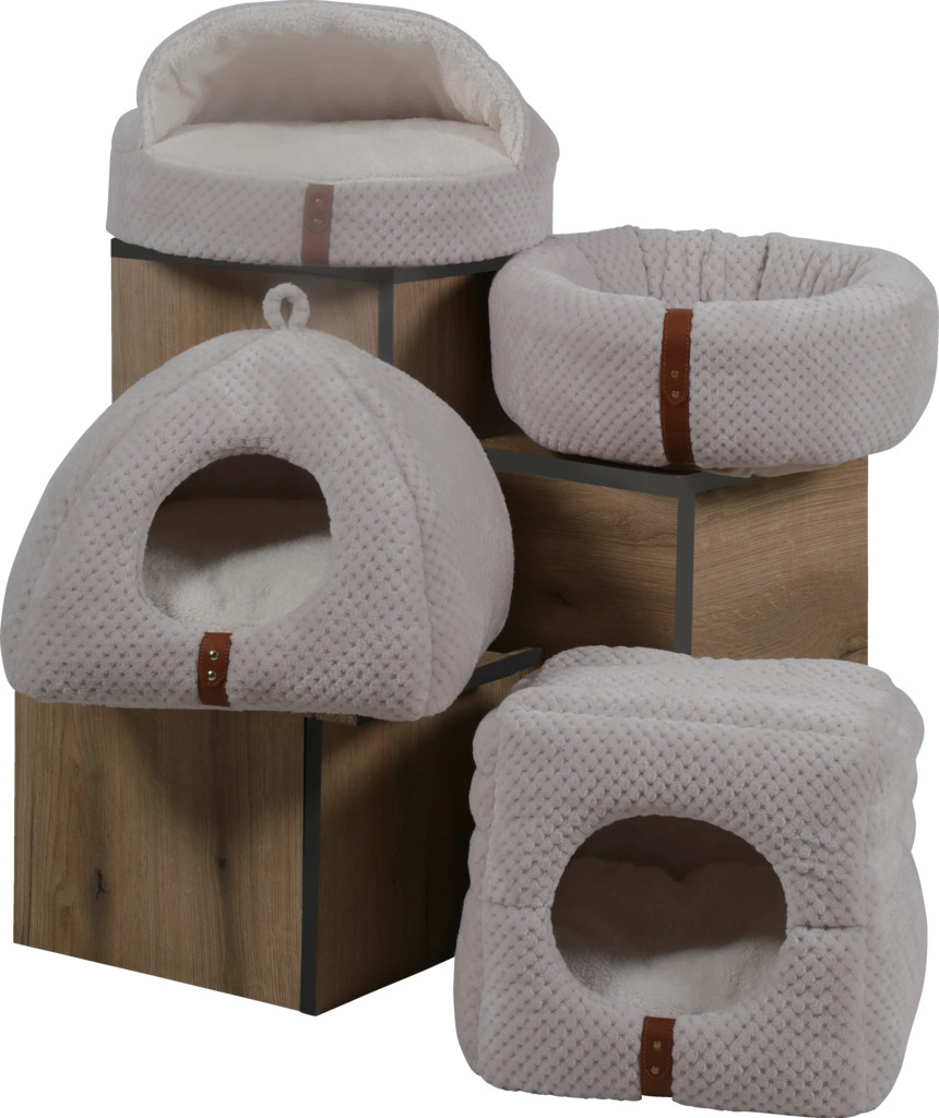 Kolekcja legowisk dla kotów PALOMA to połączenie komfortu, elegancji i funkcjonalności. W jej skład wchodzą kostki 2 w 1, które z zamkniętej budki można przekształcić w koszyk, igloo, poduszka z przykryciem oraz okrągły koszyk. Wszystkie legowiska wykonane są z bardzo miękkiego, przyjemnego w dotyku futra syntetycznego z ozdobnymi elementami wykończenia ze skóry naturalnej z metalowymi nitami w kolorze złotym. Możliwość prania w pralce w temperaturze 30⁰ ułatwia utrzymanie ich w czystości. Dostępne w dwóch wersjach kolorystycznych: beżowej i szarej.