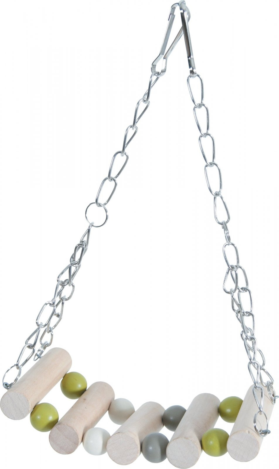 Mostek został zaprojektowany z myślą o łatwym montażu. Metalowy łańcuszek wyposażono w praktyczne karabińczyki, dzięki którym można go z łatwością przymocować do prętów klatki w dowolnym miejscu. Możliwość zmiany położenia mostka pozwala na dostosowanie go do specyficznego układu klatki oraz preferencji ptaka. ➰ - 5 drewnianych szczebelków z kolorowymi koralikami