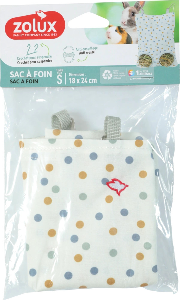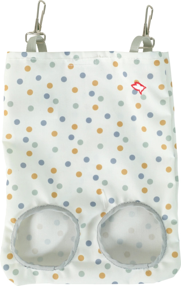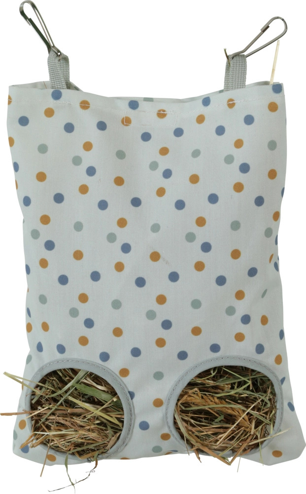 Woreczek wykonano z trwałej, ale miękkiej tkaniny, która dobrze znosi codzienne użytkowanie i pranie. Tekstylne wykończenie z haftem sprawia, że produkt jest estetyczny, a jednocześnie bezpieczny w kontakcie ze zwierzętami. Dwa otwory zaprojektowano tak, by umożliwiały wygodne pobieranie siana, a solidne haczyki zapewniają stabilne zawieszenie woreczka w klatce. Konstrukcja została opracowana tak, aby siano pozostawało suche, czyste i łatwo dostępne.