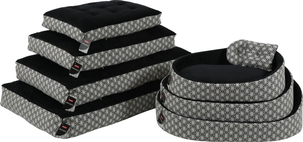 Kolekcja czarno-białych legowisk premium dla psów MALAGA to połączenie wygody z doskonałym wzornictwem. W jej skład wchodzą legowiska z izolującą poduszką piankową (dostępne w trzech rozmiarach) oraz pikowane poduchy typu chesterfield (dostępne w czterech rozmiarach). Pokryte bardzo grubym, wytrzymałym materiałem (260g/m2) z nowoczesnym nadrukiem oraz miękkim, puszystym futrem syntetycznym, zapewnią psu komfortowy wypoczynek. Wszystkie poduszki posiadają zdejmowane poszewki, które można prać w pralce w temperaturze 30⁰, dzięki czemu łatwo utrzymywać je w czystości.
