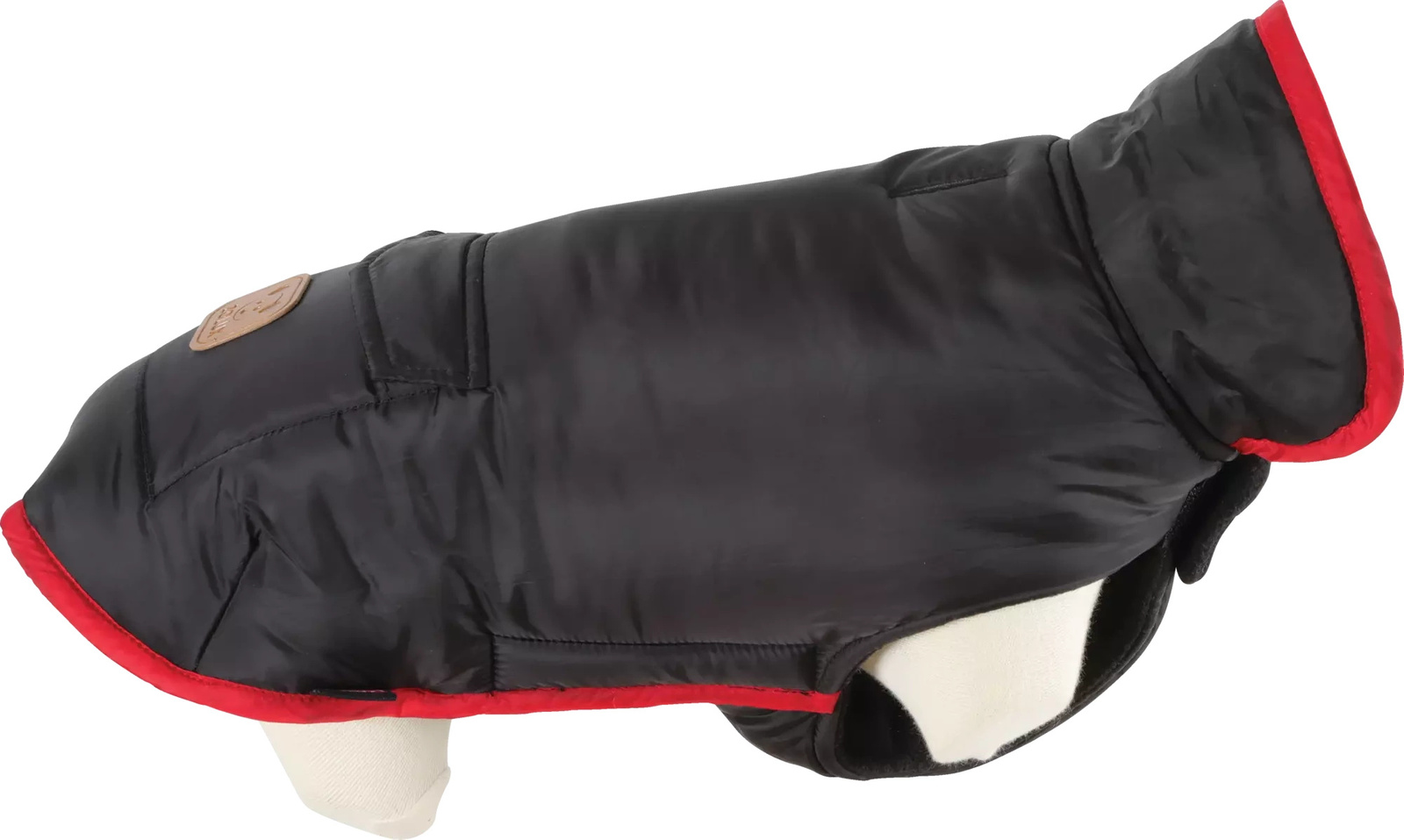 Płaszcz przeciwdeszczowy dla psów z podszewką z polaru w nowoczesnym stylu. Praktyczna i estetyczna kieszeń z dekoracyjną naszywką ze sztucznej skóry umieszczona na grzbiecie. Płaszcz regulowany przy kołnierzu i na klatce piersiowej przy pomocy rzepów i gumek. Dopasowane kolorystycznie otwory na smycz i łapy.