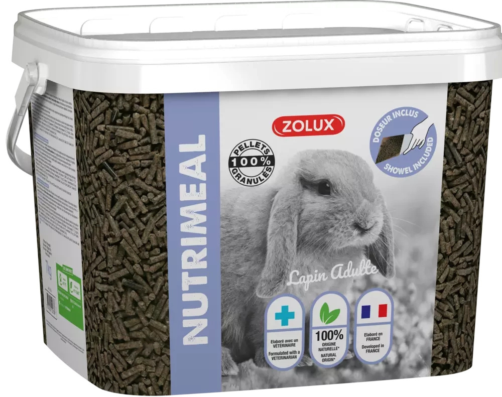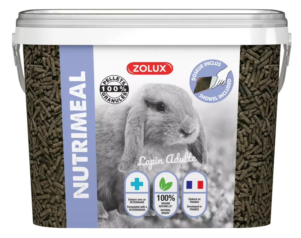 Granulat ZOLUX NUTRIMEAL 3 dla roślinożernych dorosłych królików (w wieku powyżej 6. miesiąca życia) zawiera 100% granulatu, czyli mieszankę zdrowych naturalnych surowców, sprasowanych w wysokiej temperaturze i uformowanych w grudki. Spożywanie go zapewnia zwierzętom zrównoważoną dietę, wspomaga ścieranie zębów i reguluje ich wzrost. Taka formuła pożywienia zapobiega też przebieraniu karmy. Błonnik ułatwia tranzyt treści pokarmowej, chroni też serce i naczynia krwionośne. Odpowiednio dobrana ilość wapnia zapobiega powstawaniu kamieni nerkowych.