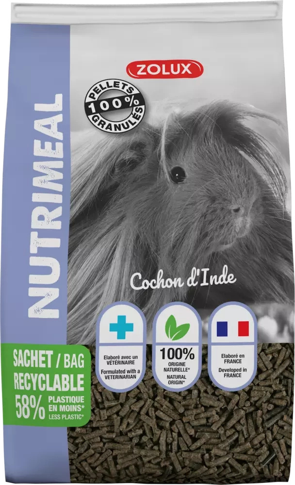 Granulat ZOLUX NUTRIMEAL 3 dla roślinożernych kawii domowych zawiera 100% granulatu, czyli mieszankę zdrowych naturalnych surowców, sprasowanych w wysokiej temperaturze i uformowanych w grudki. Spożywanie go zapewnia zwierzętom zrównoważoną dietę, wspomaga ścieranie zębów i reguluje ich wzrost. Taka formuła pożywienia zapobiega też przebieraniu karmy. Błonnik ułatwia tranzyt treści pokarmowej, chroni też serce i naczynia krwionośne.