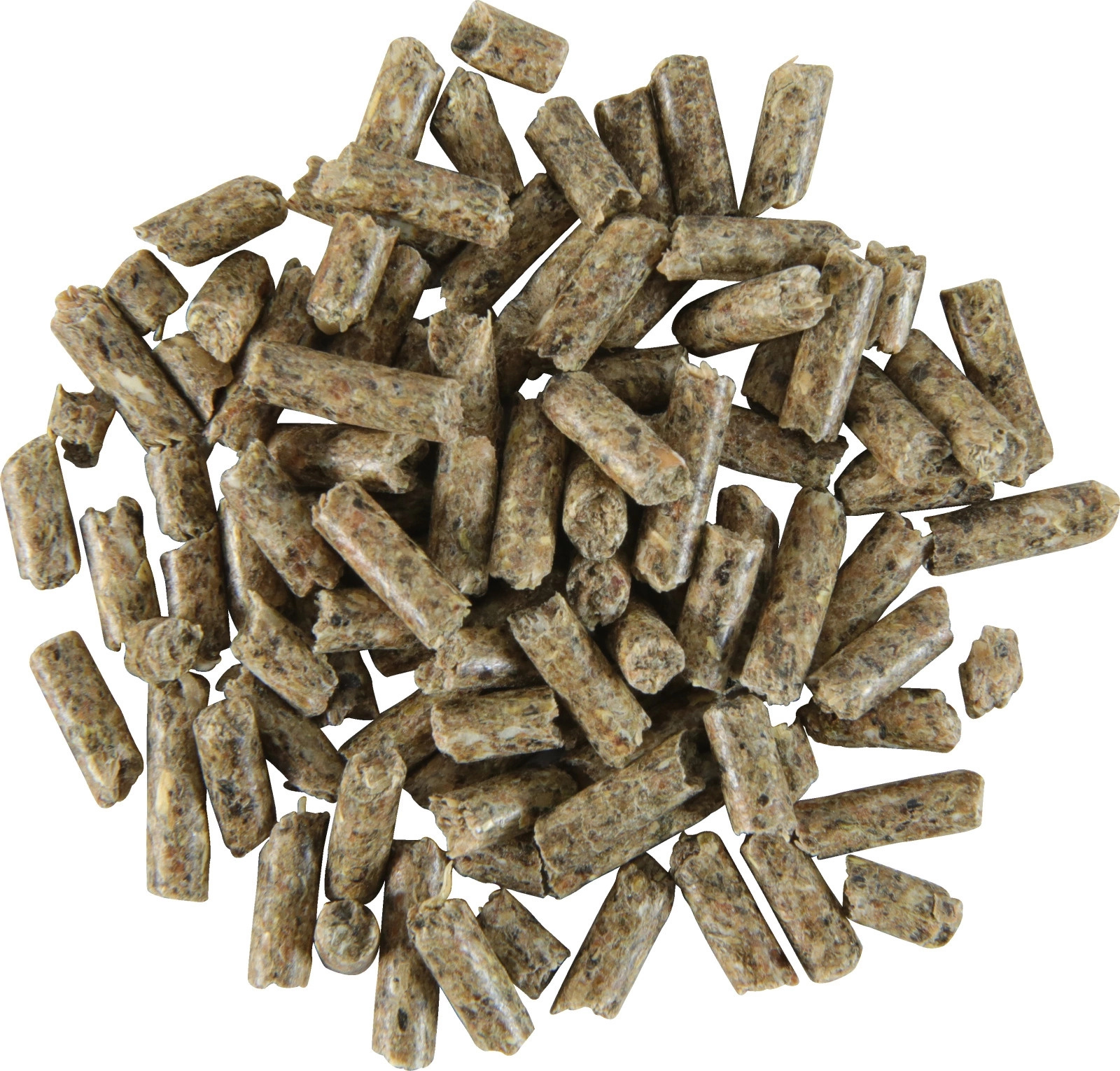 Skład: granulat 100% (makuch słonecznikowy, makuch rzepakowy, otręby pszenne, owies, pszenica, groch, ryż, suszona lucerna, kiełki słodowe, suszony burak, melasa z buraka, węglan wapnia, chlorek sodu). Składniki analityczne: białko surowe 16%, włókno surowe 14,5%, popiół surowy 6,4%, tłuszcze surowe 2,5%, wapń 1%, fosfor 0,59%, sód 0,21%.