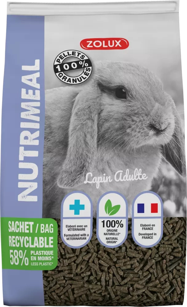 Granulat ZOLUX NUTRIMEAL 3 dla roślinożernych dorosłych królików (w wieku powyżej 6. miesiąca życia) zawiera 100% granulatu, czyli mieszankę zdrowych naturalnych surowców, sprasowanych w wysokiej temperaturze i uformowanych w grudki. Spożywanie go zapewnia zwierzętom zrównoważoną dietę, wspomaga ścieranie zębów i reguluje ich wzrost. Taka formuła pożywienia zapobiega też przebieraniu karmy. Błonnik ułatwia tranzyt treści pokarmowej, chroni też serce i naczynia krwionośne. Odpowiednio dobrana ilość wapnia zapobiega powstawaniu kamieni nerkowych.