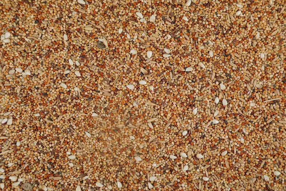 Skład: proso 86% (proso żółte, proso białe, proso czerwone), nasiona lnu, ziarna krokosza, owies łuskany, mozga kanaryjska, ziarna nigru, olej rzepakowy. Składniki analityczne: białko surowe 12,4%, włókno surowe 11%, tłuszcze surowe 5,7%, popiół surowy 2,7%.