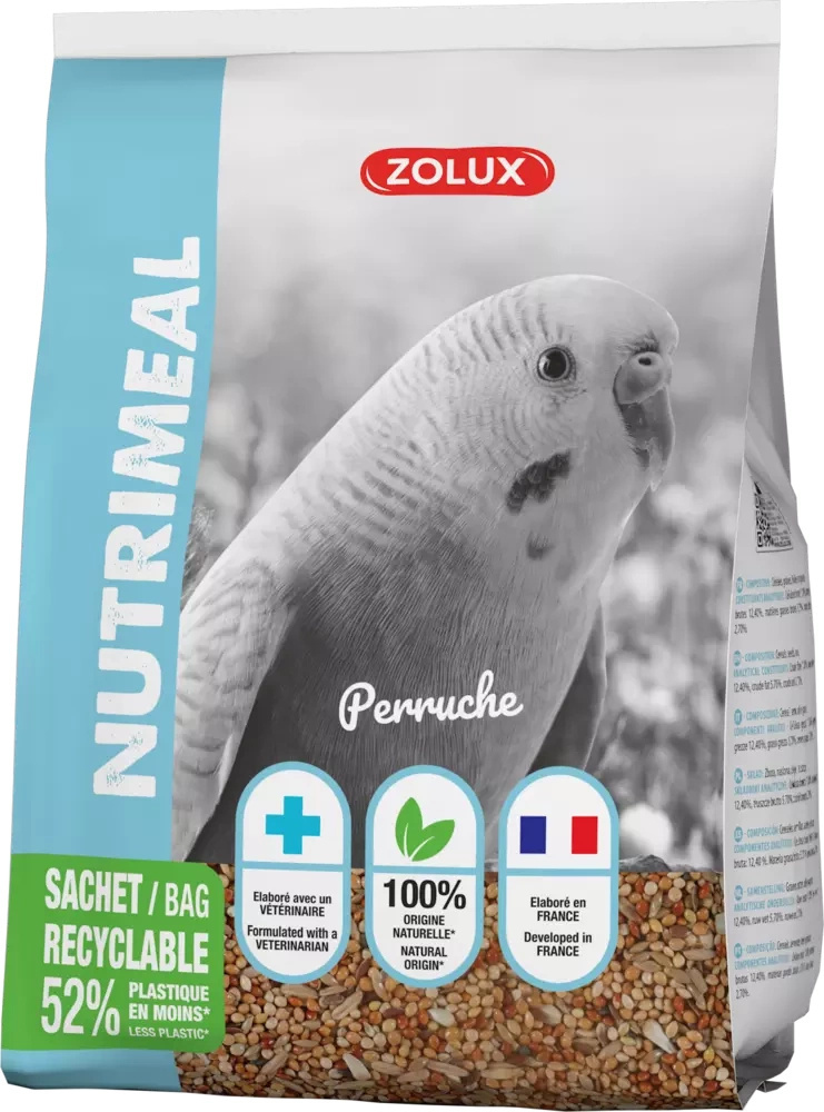 Mieszanka ZOLUX NUTRIMEAL 3 dla papużek zawiera 86% prosa, które charakteryzuje się niską zawartością tłuszczu, co zapobiega otyłości. Len dostarcza niezbędnej dawki energii, a ziarna krokosza są źródłem protein, witamin i niezbędnych nienasyconych kwasów tłuszczowych.